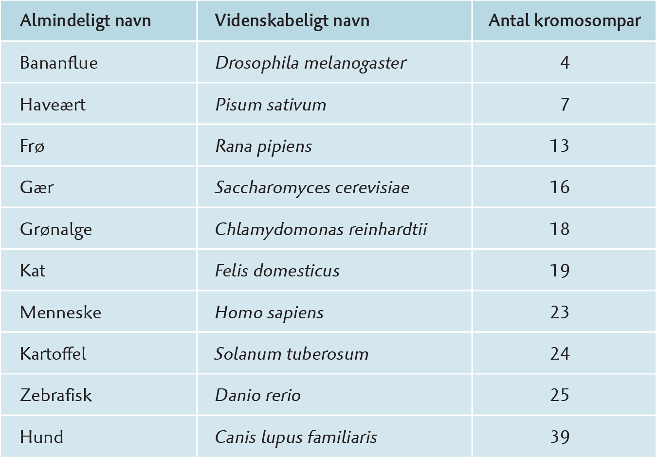 Antal kromosompar hos forskellige eukaryote organismer.