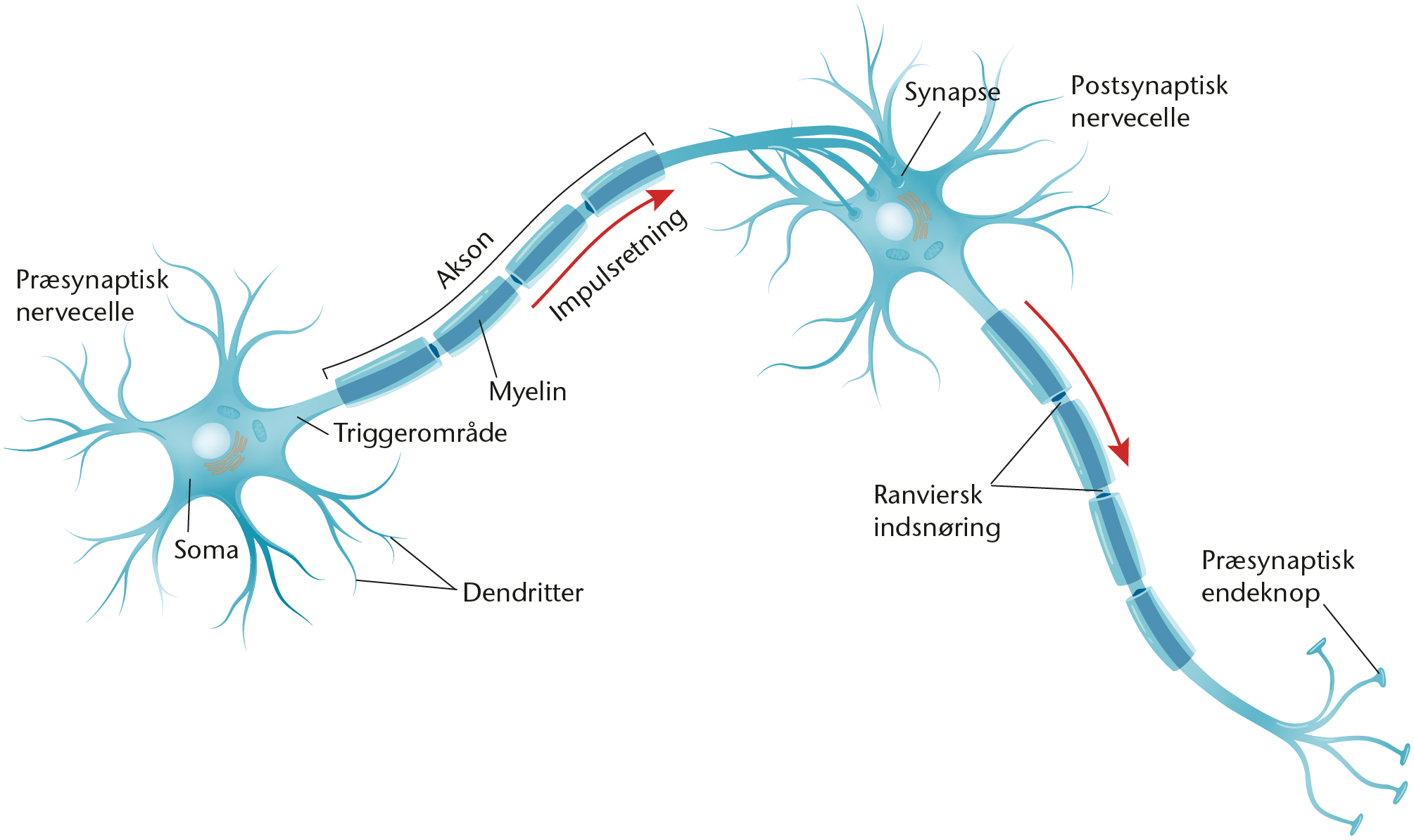 Opbygning af to nerveceller. Deres forbindelse via en synapse er vist.